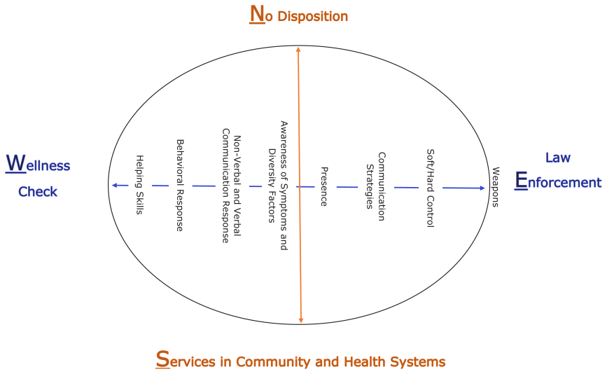 When officers are deciding on a disposition, they need to “drive” North and South and stop where it’s most appropriate. The disposition can range from no arrest to connecting to community and health services to ensure the most preventive approaches. Once officers arrive at their destination, they need to do a self-check similar to other professions at high risk for trauma and experiencing serious incidents. Similar to traditional policing, discretion and “clinical” judgement are necessary for positive outcomes.