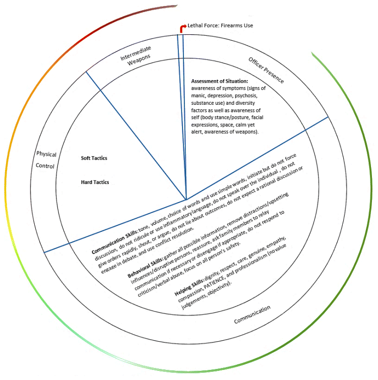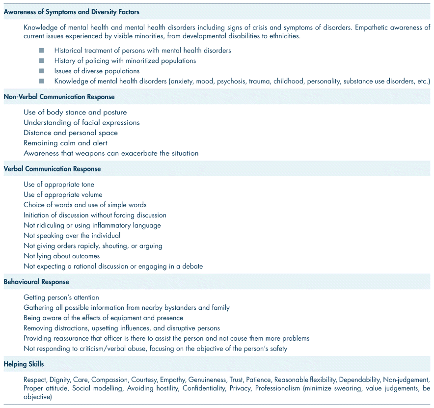 The first step is de-escalating any situation, especially in calls with mental health or diversity factors. Most calls can be de-escalated. The multiple areas involved are briefly described in Table III (Williams et al., 2019). Some questions that police in the West area use include: