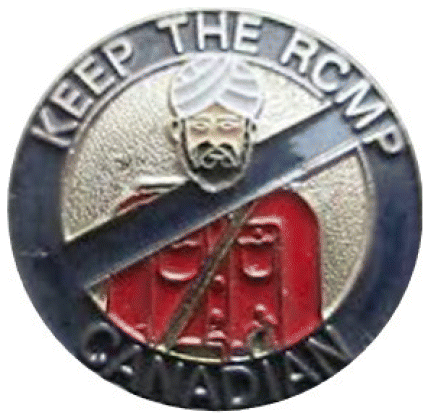 FIGURE 1 Keep the RCMP Canadian Pin Sold in 1989. This image of the pin was being sold to many Canadians when Baltej Singh Dhillon attempted to appeal his decision to become a member of the RCMP in 1989. Adapted from “Controversial Canada RCMP No Sikh Pin Keep Canadian Silver Coloured Backing” by Redmoongifts, 2020 (https://www.ebay.com/itm/Controversial-Canada-RCMP-No-Sikh-Pin-Keep-Canadian-Silver-coloured-backing-/193407724078). In the public domain. |