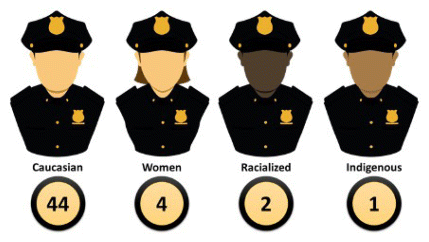 Consequently, many police services are negligent in diversifying all organizational levels, including the civilian ranks. For instance, Ontario has 51 police services, and analysis reveals that there are 44 male Caucasian police chiefs, four female police chiefs, two police chiefs from racialized minority groups, and one police chief who identifies as an Indigenous person (Ministry of the Solicitor General, 2019; Ontario Association of Chiefs of Police, 2020) (Figure 2). This blatantly illustrates the racially vertical mosaic consisting of a “Caucasian male culture” in policing (Jain et al., 2000, p. 68).