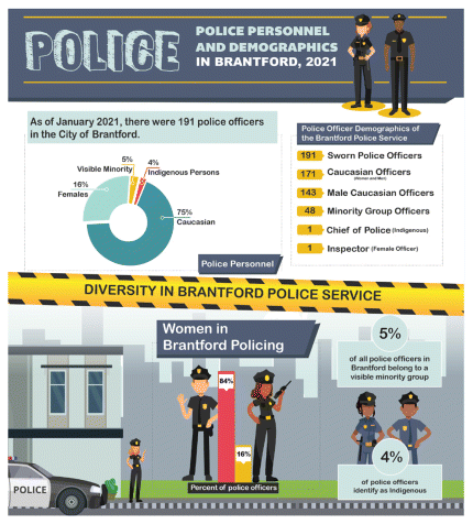FIGURE 3 Demographics of Police Personnel in the Brantford Police Service, 2021. The infographic illustrates the demographics of police officers at the Brantford Police Service. Adapted from “January 2021 – Brantford Police Service Sworn Roster,” by Raj Saini 2021. |