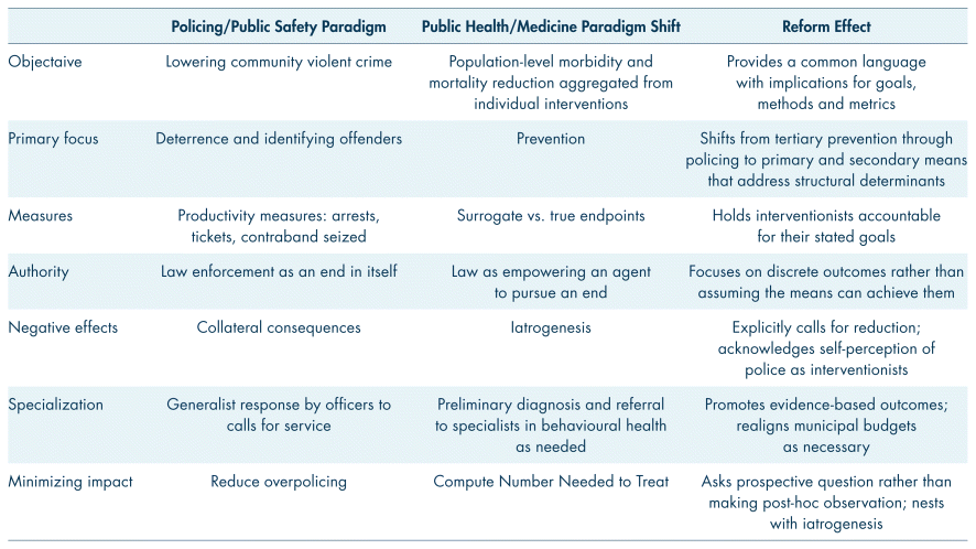 This will require collaboration between the fields of public safety and public health. It will require the introduction of public health terminology into policing in order to establish a common language for setting goals and measuring results, a step that may empower communities to hold police officials accountable in ways that have so far proven elusive (Table I). In theory, this is not a radical recommendation. Police officials already name public health-related goals as their ultimate objectives: to reduce morbidity and mortality related to violence, non-violent victimization, roadway safety, and emergency responses to risk behaviors associated with drug use and mental illness. While this should be a cause for optimism, to transform these stated objectives into actual policy and practice will require that these goals be more explicitly internalized within police departments.