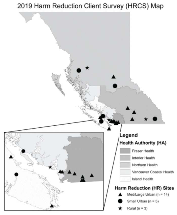 Methodological details of survey administration, including recruitment, eligibility, and data collection, have been described in prior publications (Karamouzian et al., 2020; Kuo et al., 2014; Moustaqim-Barrette, Papamihali, Crabtree, et al., 2019). A total of 22 harm reduction sites participated in the 2019 survey (Figure 1). In summary, participating sites were provided CA$5 for each client interviewed to account for resources and time allocated to administer the four-page survey. Surveys took approximately 10 minutes to complete and participants were offered CA$10 for their participation in the 2019 HRCS.