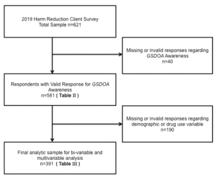 The 2019 HRCS was conducted between October and December 2019. The 2019 survey was revised prior to administration to address emerging harm reduction issues and feedback from stakeholders, including PWUD (Moustaqim-Barrette, Papamihali, Crabtree, et al., 2019). Questions evaluating respondents’ awareness and understanding of the GSDOA were developed based on the review of prior literature and feedback from co-investigators and people with lived or living experience involved in the Professionals for Ethical Engagement of Peers (PEEP) advisory group at BCCDC. These questions were then piloted with PWUD at Vancouver Area Network of Drug Users (VANDU) and added to the 2019 survey.