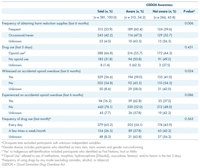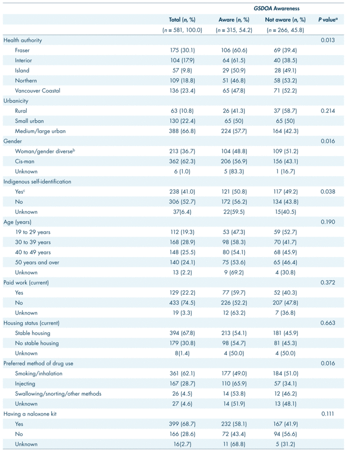 Stratification of the study variables by GSDOA awareness can be found in Table II. The prevalence of GSDOA awareness among cis-men was 56.9%, compared with 48.8% among women and gender diverse participants (trans men, trans women, gender non-conforming). GSDOA awareness was most common among respondents who reported having paid work (59.7%), were aged 30 to 39 years (58.3%), accessed services in the Interior Health (61.5%) or Fraser Health (60.6%) regions, and accessed services in medium or large urban areas (57.7%). GSDOA awareness was higher among those who used opioids in the last 3 days (55.7%); and prefer injecting as their method of drug use (65.9%). GSDOA awareness was higher among those who reported having a naloxone kit (58.1%) and those who obtained harm reduction supplies more frequently in the last 6 months (60.4%). High proportions of GSDOA awareness were also reported by those who witnessed (59.0%) or experienced (62.8%) an opioid overdose in the last 6 months.