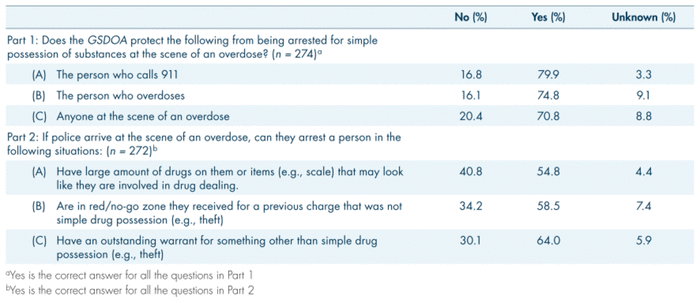 A secondary analysis was conducted to assess the understanding of when and to whom the GSDOA provides legal protection at overdose events.