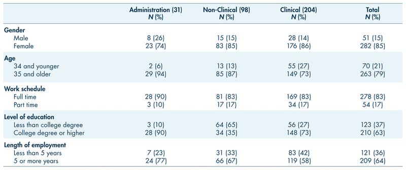 Surveys were electronically distributed to all hospital employees (725) . A total of 341 surveys were completed, yielding a response rate of 47%. Eight respondents did not identify their employee role, and their responses were removed from the sample, leaving a total sample of 333 evaluated surveys. Of the total sample, approximately 9% of respondents were administration, 30% came from non-clinical staff, and 61% came from clinical staff. This employee role breakdown appears to be representative of the total hospital employee role breakdown. The majority of respondents were older than 35, were full-time employees (working 32 or more hours a week), had a college degree or higher, were employed for five years or more, and were overwhelmingly female (Table I). The significant gender disparity in the responses is consistent with hospital representation, as the hospital typically employees 85 females to every 15 males. Non-clinical staff was the only employee role that had a majority of employees holding less than a college degree. This remains consistent with positions that often do not require advanced education, such as cafeteria employees, custodial staff, or lobby attendants.