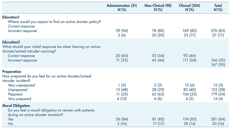 When asked where they would expect to find an active shooter policy, administration were most likely to produce a correct response (94%), followed by clinical staff (83%) and non-clinical staff (80%; Table II). Additionally, when asked what the initial response should be when hearing an active shooter/armed intruder warning, only half of the overall employees produced the correct response. The majority of administration (65%) reported a correct answer, followed by non-clinical staff (54%) and then clinical staff (46%). When asked about how prepared they felt for an active shooter/armed intruder incident, administration reported feeling the least prepared, with 51% feeling either very unprepared or unprepared. Approximately 46% of clinical staff felt very unprepared or unprepared, while 31% of non-clinical staff felt very unprepared or unprepared. In terms of a sense of moral obligation to remain with patients during an active shooter situation, the majority of employees reported yes and were similar (83–85%) across employee roles.