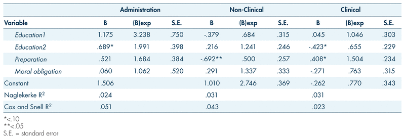 Logistic regression models of employee role and education, perceptions of preparation and moral obligation in hospital active shooter situations