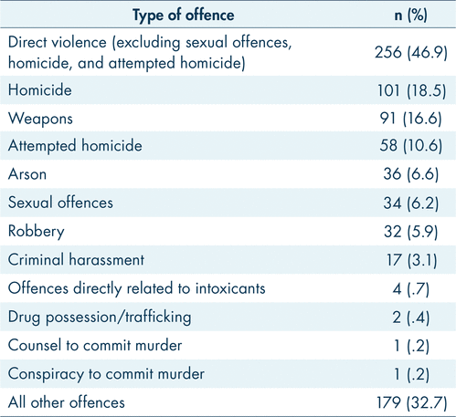 Index offences were coded using legal dispositions issued from the court. When coding the types of crimes that NCR accused were implicated in, every offence type was counted for with every NCR patient. As a result, cumulative percentages exceeded 100% because of multiple index offences. If an NCR patient had more than one charge for the same index offence, the offence was only counted once. For instance, if a person was convicted of two assaults and one weapons offence, then this would be coded as the patient being found NCR for the violent and weapons offence types. Sexual offences included the following categories: attempted sexual assault, sexual assault, indecent act, and sexual touching. Direct violent offences included the following categories: assault, assault with a weapon, attempting to choke, unlawful wounding, direct threats to another person, hostage taking, kidnapping, and unlawful confinement. The category of weapons offences included possession offences or careless use of a firearm. Offences directly related to intoxicants included: impaired driving, failure to provide a breath sample, and public intoxication. The category of other offences included break and enter, property crime, extortion, mischief, driving offences, administrative justice offences, resist arrest, negligence offences, and fraud. Table I illustrates the distribution of index offences.