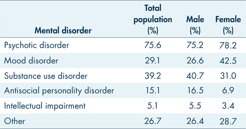 The National Trajectory Project (NTP) (Crocker et al., 2015; Nicholls et al., 2015) examined NCR accused in Canada across Quebec, Ontario, and British Columbia. There was a greater proportion of male (84.4%) to female (15.6%) NCR accused. This finding converges with several other studies (Livingston, Wilson, Tien, & Bond, 2003; Latimer & Lawrence, 2006; Miladinovic & Lukassen, 2014). The average age reported was 36.56 years, with the age of women (40.6) being older at the time of index offence than men (35.8). Approximately one-half graduated from high school overall; more women (60.1%) graduated than men (47.3%). The data indicated that most persons found NCR were single (83.6%), with the remainder being in a relationship (16.4%). The primary diagnosis at the time of NCR finding included psychotic spectrum disorder (70.9%), mood spectrum disorder (23.2%), substance abuse disorder (30.8%), personality disorder (10.6%), and combinations of the previous. Index offences at NCR finding involved a greater number of crimes against persons (64.9%) than property offences (16.9%) and other criminal code violations (18.2%). Supporting other studies, assault accounted for one-quarter to one-third of all index offences across the three provinces (Livingstone et al., 2003; Crocker et al., 2011).