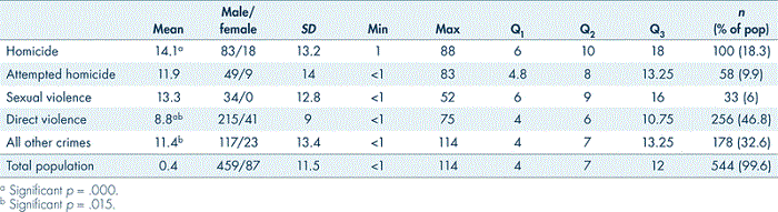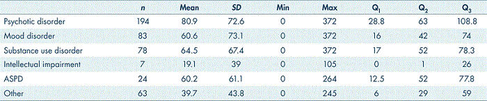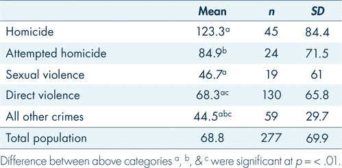 When analyzing the impact of mental disorder on the offending profile, there was no difference in crimes committed across all disorders. Crimes held the general trend of being mostly homicide and direct violence, with a minority of cases evenly divided into attempted homicide, sexual violence, and all other crimes.