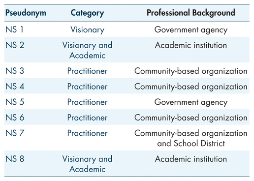 A total of eight key informant interviewees participated in this study. Table I shows their background. The researcher’s social capital in Nova Scotia contributed to the recruitment of four of the key informants. The others were recruited via snowball sampling. The interview participants are numbered (NS1 to NS8) for anonymity.