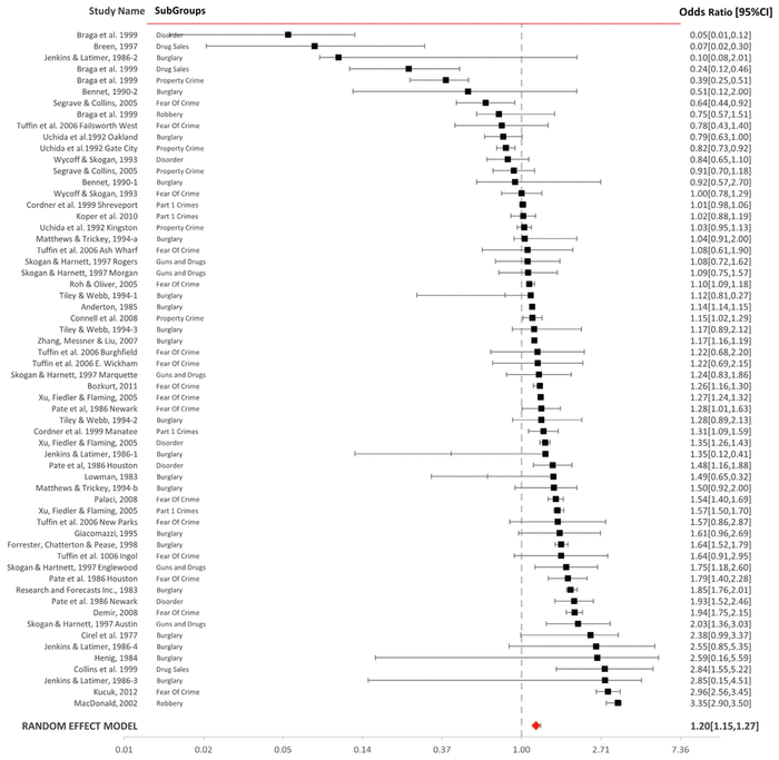 Table III also shows the mean OR for the 60 evaluations is 1.197 using the random effects model. This mean effect size is statistically significant at p < 0.001. A mean OR of 1.19 can be inferred to mean that listed crimes were 19% greater in the control area compared with the treatment area or that it decreased by 16% (1 – 1/OR) in the treatment area compared with the control area.