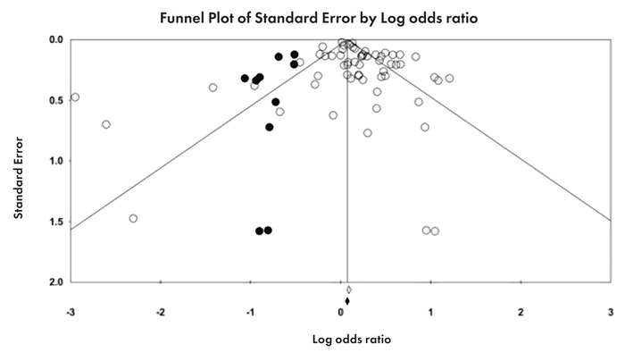 Fail-safe N, with alpha set at 0.05, indicated that 857 missing studies with a zero effect size would bring the p value higher than the alpha, i.e. nullify the significant effect at p > 0.05.