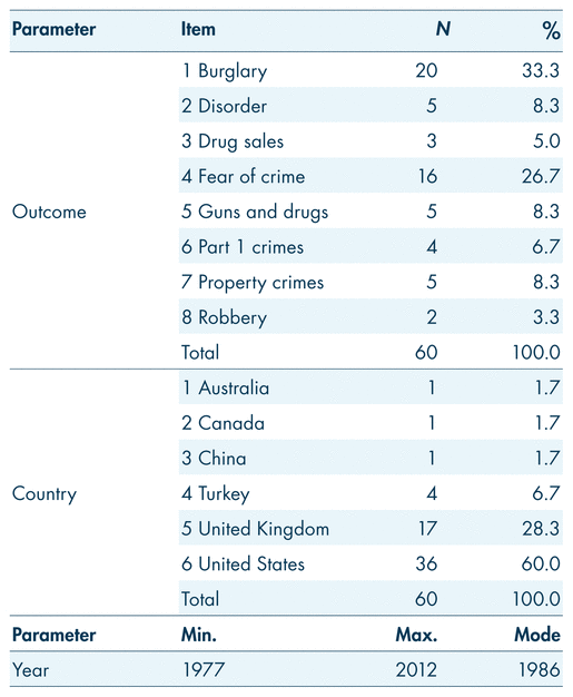 Table II presents a summary of the characteristics of the studies included in the meta-analysis. All of the studies were published between 1977 and 2012. More than half (60%) of the studies were conducted in the United States. Studies conducted in the United Kingdom comprised 28.3%. Four studies were conducted in Turkey and one each from China, Canada, and Australia. Most evaluations included burglaries (20) and fear of crime (16).