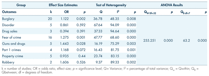 Moderator analysis of the outcome indicated a significant effect on the variation of the ORs. There are major differences between the ORs of the studies based on their outcomes (QB = 63.2, df = 7, p = 0.000). Studies measuring burglary (OR = 1.122), fear of crime (OR = 1.275), guns and drugs (OR = 1.443), Part 1 crimes (OR = 1.168), and robbery (OR = 1.606) have ORs > 1. We can conclude that CP is effective to reduce these types of crime. On the other hand, CP has no effect on reducing crimes related to disorder, drug sales, and property crime (OR = 0.861, 0.394, and 0.935, respectively).