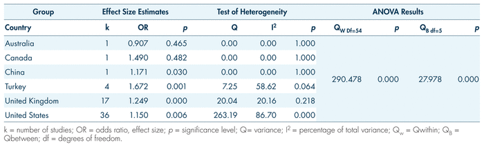 Two categorical moderators were defined in the meta-analysis: outcome and country. These categorical moderators are used in moderator analysis to examine the potential for differences in the overall effect sizes of the studies. The results of the moderator analysis are presented in Table IV.