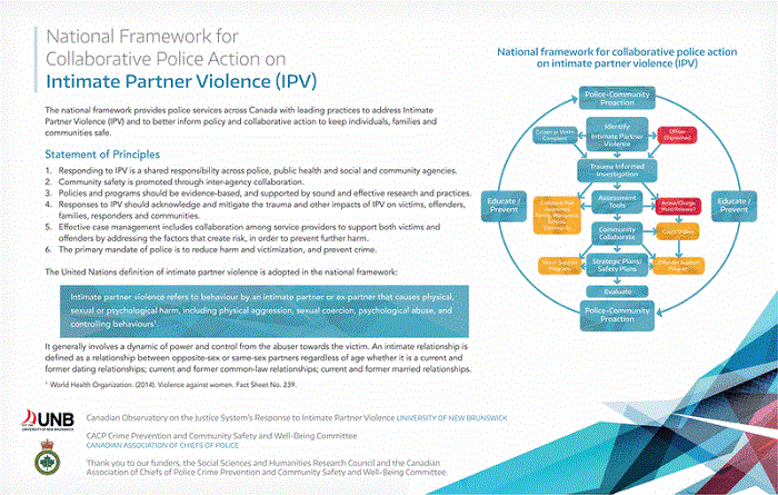 The National Framework for Collaborative Police Action to Intimate Partner Violence is a document designed to provide police services across Canada with a guide to leading practices to address intimate partner violence (IPV) and to help police leaders better inform policy development and subsequent police action. The National Framework espouses the importance of a multi-agency, multi-pronged collaborative model designed to keep individuals, families, and communities safe. The document provides a shared language and understanding of IPV that can be used among police agencies and with community partners. The National Framework is the result of collective efforts involving subject matter experts from policing, academia, and community organizations, and was rooted in research funding from the Social Sciences and Humanities Research Council of Canada made available to the Canadian Observatory on the Justice System’s Response to Intimate Partner Violence at the University of New Brunswick. In August 2016, the National Framework (NF) was officially endorsed by the Canadian Association of Chiefs of Police.