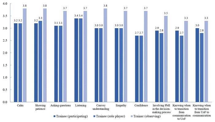 Another set of survey questions assessed how useful SV was in developing general knowledge and skills among trainees that are relevant to interactions with PMIs. The participants indicated their ratings on Likert scales ranging from 1 (Strongly Disagree) to 5 (Strongly Agree). Average scores were calculated. As illustrated in Figure 2, both groups of trainees (participating, n = 26; role players, n = 22) rated the impact of SV training positively. All items received a score of at least 3.8 out of 5. As illustrated in Figure 3, both groups of trainers (observing, n = 6; role players, n = 6) also rated the impact of SV training positively. All items received a score of at least 4.7 out of 5.