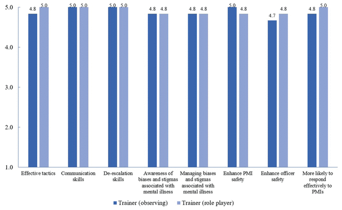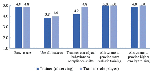 One set of survey questions asked the trainers (observers, n = 6; role players, n = 6) to reflect on how easy SV was to use as a training tool and on the contributions that SV made to their service’s mental health training. Participants indicated their ratings on Likert scales ranging from 1 (Strongly Disagree) to 5 (Strongly Agree), and average scores were calculated based on the ratings. As illustrated in Figure 1, both groups of trainers rated SV very positively. All items received a score of at least 3.8 out of 5.