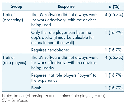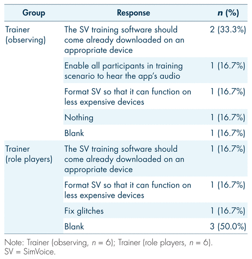 As illustrated in Table III, roughly 60% of each sub-sample of trainees either indicated they had no suggestions for how to improve SV training or they left this question blank. The most common response that emerged (roughly 15% of the sub-samples) was that the versatility of scenarios could be enhanced to improve SV training. As illustrated in Table IV, trainers also suggested ways in which SV could be improved, although roughly 30% of the observing trainers and 50% of the role players either indicated they had no suggestions or left this question blank. The most common response was that SV software should come already downloaded on the device it will be used on, as there were issues with hardware and software compatibility.