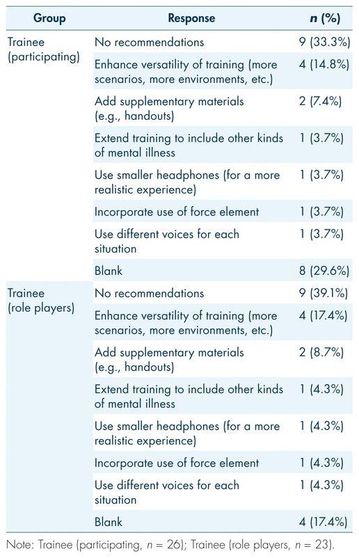 The final sample consisted of n = 27 trainees who acted as responding officers in the SV training. They had an average age of 26.6 years (standard deviation [SD] = 3.2) and 1.1 (SD = 1.0) years of service. This sample consisted of 8 female participants (29.6%), 15 male participants (55.6%), and 4 participants who did not indicate their gender (14.8%). Of the trainees, 23 indicated their rank as Constable, whereas 4 participants did not indicate their rank. Most participants (n = 23) indicated they had no previous specialized training on police-PMI interactions. The final sample also consisted of n = 23 trainees who participated as role players in SV training (i.e., they played the role of the PMI experiencing the auditory hallucinations). This group had an average age of 26.6 years (SD = 3.2) and 1.1 (SD = 1.0) years of service. There were 8 female participants (34.8%) and 15 male participants (65.2%). All participants indicated their rank as a Constable. Most participants (n = 19) indicated they had not completed previous specialized training on police-PMI interactions.
