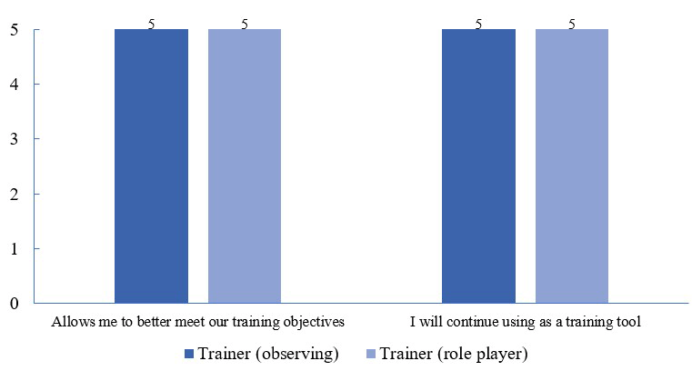 Finally, both groups of trainers (observing, n = 6; role-players, n = 6) were asked to provide their overall assessment of SV training by providing ratings on two items using Likert scales ranging from 1 (Strongly Disagree) to 5 (Strongly Agree). As illustrated in Figure 5, the overall assessment was very positive.