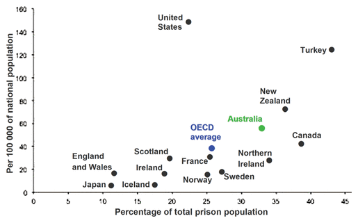 ■ Indigeneity (Australian Aboriginal people make up 28% of all inmates, but only represent 3% of the general population; the imprisonment rate for Aboriginal and Torres Strait Islanders has increased by 35% since 2006, compared with 14% for the nonIndigenous population),