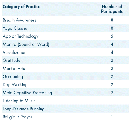 A broad spectrum of contemplative practices was identified, with each study participant engaging in at least two different types of practice. The most commonly cited categories of practices were breath awareness exercises (8) and yoga classes (8). The use of trademarked technology or app-based meditations such as Headspace, Oura Ring, or Insight Meditation were also frequently reported (5). Several participants (4) reported using a mantra (either sound or word) during their meditation practice, while the same number reported engaging in positive visualization practices (4).