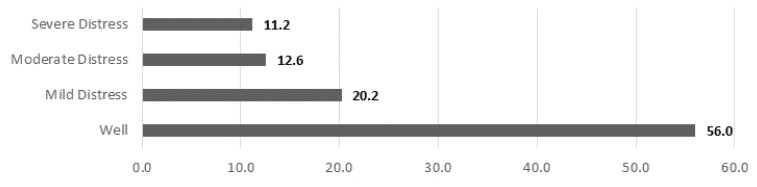 Figure 1 provides an overview of the levels of psychological distress of the officers in the current study. It was found that 44% of officers are experiencing some level of psychological distress. Of the officers surveyed, 23.8% are experiencing moderate or severe psychological distress.