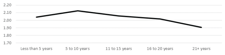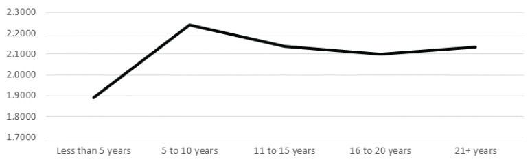 It was found that male officers (M=1.98, SD=0.69) reported significantly lower levels of psychological distress than their female officer colleagues (M=2.11, SD=0.74), t(2642) = 3.55, p < .001. Significant differences were also found in the experience of psychological distress as a function of years of service, F(4,2673) = 9.345, p<.001. Those officers who had 21 and more years of service (M=1.91, SD=0.66) had lower levels of psychological distress than officers with 5 to 10 years of service (M=2.12, SD=0.72); 11 to 15 years of service (M=2.06, SD=0.74); and 16 to 20 years of service (M=2.02, SD=0.72). No significant differences were found for psychological distress as a function of agency size Figure 2.