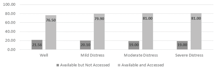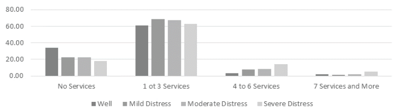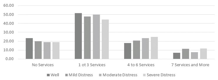 FIGURE 6 Reported psychological distress by number of available services (agency-provided) Examining the proportion of officers who are accessing services as a function of their current level of psychological distress (Figure 7), around 80% of officers who report experiencing mild, moderate, or severe distress are accessing a service when it is available to them. A significant percentage of officers who report being well (76.5%) are also accessing services. Officers experiencing mild, moderate, or severe distress are for the most part accessing one to three services (Figure 8).