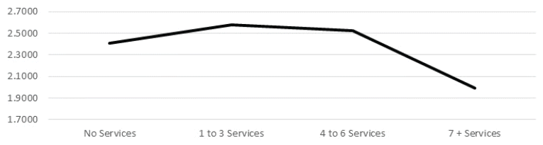 Of those officers who had a service available to them, around 80% of officers experiencing some level of psychological distress accessed at least one agency-provided service. Significant differences were found in the psychological distress being reported by officers as a function of whether or not they had agency-provided services available to them, F(3,2674)=16.17, p<.001. Those officers in agencies with 7 or more services available (M=1.94; SD=0.68) were significantly less likely to report psychological distress than officers in agencies that had no services available to them (M=2.26; SD=0.72); 1 to 3 services (M=2.17; SD=0.75); and 4 to 6 services (M=2.15; SD=0.73) (Figure 6).