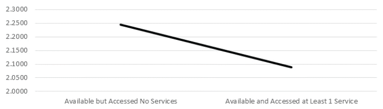 The study further revealed significant differences on help-seeking stigma according to whether officers had or had not accessed a service provided by the agency, F(1,2635) = 8.79, p<.01. Officers who had accessed at least one service (M=2.09; SD=1.10) had lower perceptions of help-seeking stigma than those in agencies where a service was available but who did not access it (M=2.25; SD=1.22) (Figure 12).