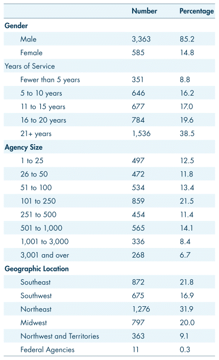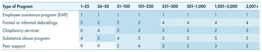 Table III reports on the availability of the top five agency-provided services that were identified in the previous table according to agency size. A rating of one indicates that this agency-provided service was the most reported service by officers employed in that size agency. A rating of nine indicates that this is the least reported service by officers employed in that size agency. Consistent with previous findings, regardless of agency size, employee assistance programs (EAPs) or similar specialist psychological or psychiatric services were the most available programs. It is interesting to note that availability of peer support, while commonly reported by officers employed in larger agencies (agencies with greater than 251 sworn staff), was reported by very few officers employed in smaller agencies (agencies with fewer than 51 staff). The opposite trend was noted for formal or informal debriefings, with data indicating that smaller agencies, particularly those with fewer than 251 sworn staff, may rely more heavily on this type of service to support staff, compared with larger agencies.