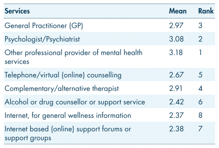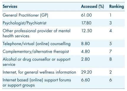 Just under 70% of respondents accesses some form of external services (Figure 5). The most accessed type of service was General Practitioners. This was followed by accessing internet resources for general wellness information and engaging with services provided by psychologists or psychiatrists (Table V).