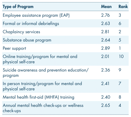 Table II indicates that the most commonly available agency-provided service was an EAP or similar specialist psychological or psychiatric service. Over 90% of officers reported having access to this type of program. Over 80% of officers had access to programs such as chaplaincy services, substance abuse programs, and peer support. The least commonly available, although still available to over half of the officers surveyed, was annual mental health or wellness check-ups.