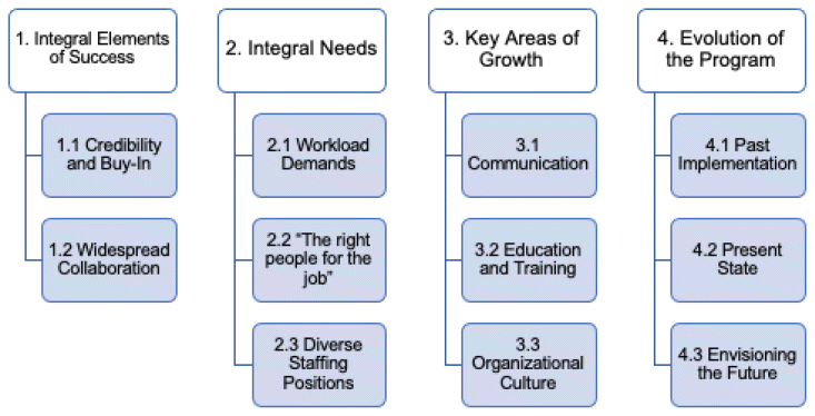 The data exhibited dense sample specificity, and strong, focused dialogue, which allowed the perceived information power to be reached with fewer participants than originally anticipated (Malterud et al., 2016). The research team experienced saturation, where no new patterns emerged from the data thereafter, after four focus groups and 12 participants. Through the thematic analysis, four main themes were identified: (1) Integral elements of success, (2) Integral needs, (3) Key areas of growth, and (4) Evolution of the program (Figure 1). The themes are summarized below, with detailed descriptions and supporting quotes within Tables II to V.