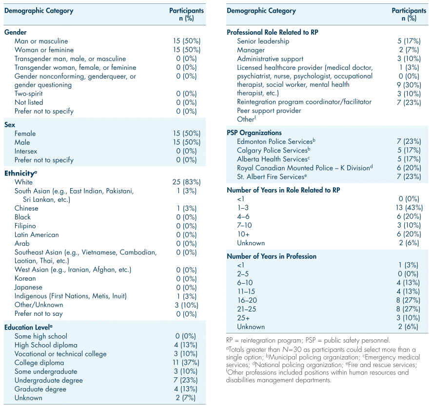 Demographic details of study participants (N=30) are presented in Table I. Study participants belonged to one of five participating PSP organizations and had varying levels of experience and involvement within their respective RPs. It was noted that three of the five organizations had implemented both the short-term critical incident and long-term RP streams. Although not explicitly captured through the questionnaires, it was observed that some stakeholders had also engaged in the RP as a PSP participant and utilized this in their own return to work following an illness or injury.