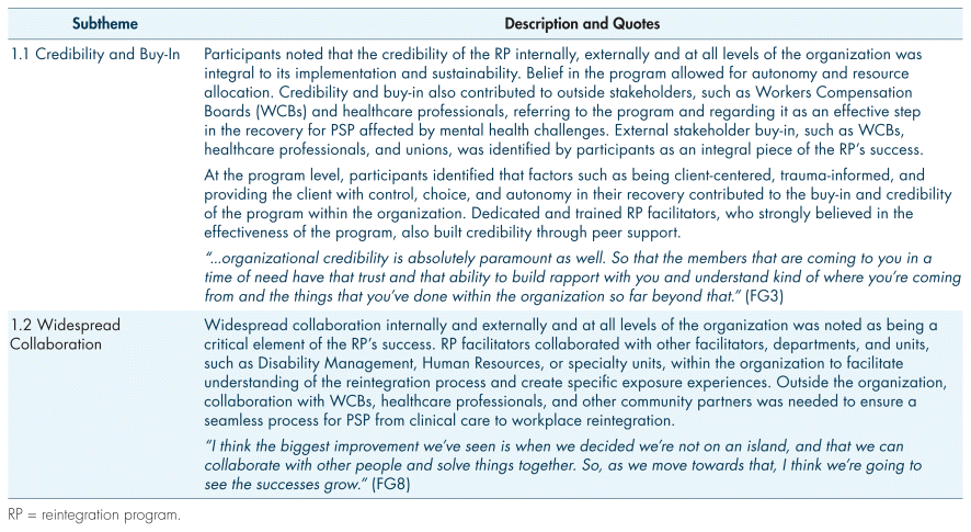 In the first theme, widespread credibility and buy-in throughout the organization was noted to be paramount to the program’s implementation and sustainability. This is consistent with existing literature demonstrating that programs valued by PSP organizations and stakeholders will encourage greater participation and engagement (Sutton & Polaschek, 2022). Conversely, a negative reception of a program may indicate that participants regard the content as irrelevant or may perhaps point to deeper problems with organizational culture (Lennie et al., 2020). Peer-led programs are also generally regarded favourably by PSP (Sutton & Polaschek, 2022). The key stakeholder participants regarded their respective RPs highly. They believed the RPs contributed to better return-to-work outcomes and had a high economic return on investment. They also noted that collaboration, both internal and external to their respective organization, was another key to the success of the RP.