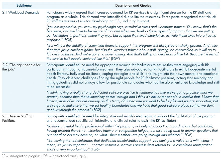Key stakeholder participants identified integral needs of the RP centering around staffing challenges. RP facilitator positions were observed to have substantive workload demands while being emotionally demanding. Such a tempo creates potential for staff to experience their own psychological injury. Also highlighted was the imperative to have the “right person for the job,” and the challenges in assuring the best candidate for the RP is selected to support the program. Participants further identified the need for a diverse team with RP facilitators who are respected and knowledgeable in their field (Table III).