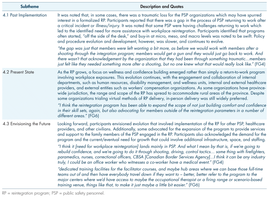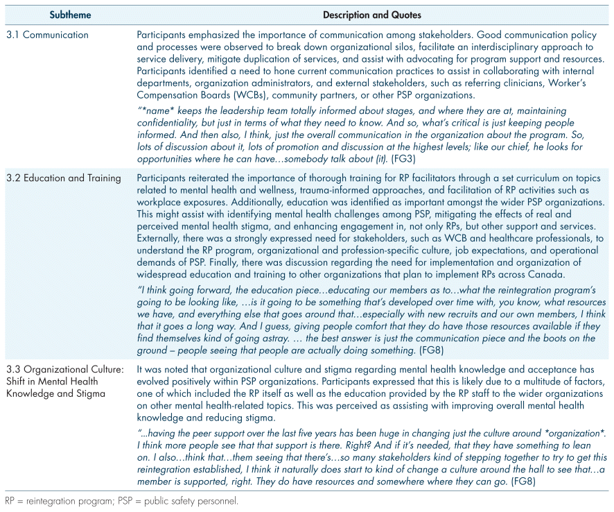 Future planning, development, organization, implementation, and spread of education, training, and communication policies and processes internal to the respective PSP organizations as well as to external stakeholders was identified in the third theme as an area of growth. Further, education, training, and communication among PSP regarding mental health topics has been shown to improve organizational wellness among PSP (Edgelow et al., 2022). For police, workplace culture was the most frequently encountered negative organizational factor that affected the mental health of staff (Edgelow et al., 2022). Efforts to improve workplace culture, reduce stigma, and provide organizational support could contribute to better mental health among PSP. The RP, through promotion and education, has been shown to play a role in these efforts. Furthering engagement internal and external to PSP organizations through educational efforts as well as expanding resources to help more PSP with workplace reintegration across Canada was envisioned by participants, all of whom were positive about the future direction of the RPs as noted in Theme 4.