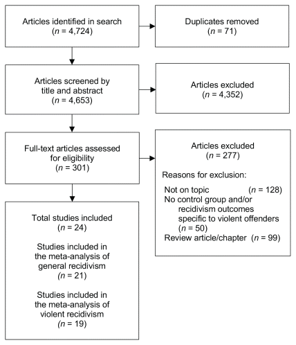 This research replicates and extends a meta-analysis conducted by Papalia et al. (2019), adding research published up to July 5, 2021. These studies—and their characteristics—are shown in Supplemental Table I. Studies were located by searching Google Scholar as well as government websites from Australia, Canada, the United Kingdom, and the United States. Articles that did not report outcome data for individuals with a history of violent offending separately from other offenders in the sample were not used in the current analysis unless more than 90% of the treatment group had committed a violent offence (see Supplemental Table I). The authors of three studies (Arbour, 2021; Capellan et al., 2022; Seewald et al., 2018) provided outcome data via e-mail for individuals who had committed violent offences within their sample. Some researchers reported results for individuals who completed the intervention, while others used an ITT design (reporting outcomes for those who were assigned to the treatment group, regardless of whether they completed the intervention). When outcome data were available for both completers and ITT, the ITT data were used (see Supplemental Table I). Figure 1 illustrates the study selection process. Altogether, a total of 24 studies were included in the two meta-analyses: 21 studies of general recidivism and 19 studies of violent recidivism. Sixteen studies report outcomes for both general and violent recidivism (see Supplemental Table I).