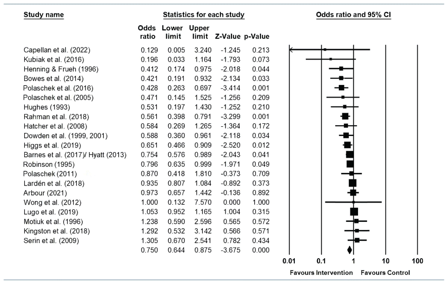 Overall, eight of the 21 studies reported a statistically significant (p ≤ .05) reduction in general offending, eight showed a non-significant reduction, one study reported a p value of 1.000, and four showed a non-significant increase in recidivism. Using the random-effects model, the pooled OR was 0.750 with a corresponding p value of ≤ .001. Therefore, the odds of general/nonviolent recidivism were 25% lower for individuals who participated in interventions compared with the control group. The 95% confidence interval (CI) is 0.644 to 0.875; this is an index of the precision of the estimate of the mean effect size. The Z value for testing the null hypothesis (that the mean effect size is zero) is −3.675.