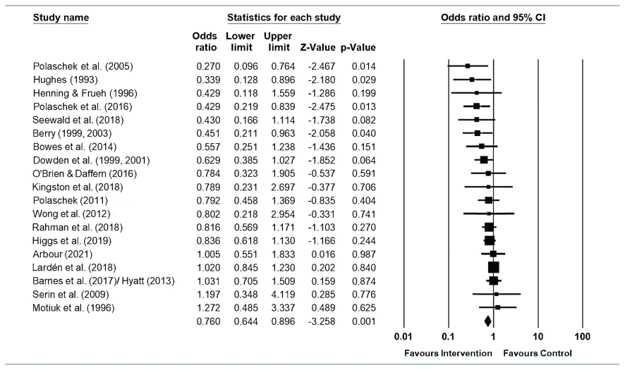 Using the random-effects model, weights assigned to the 19 studies ranged from 1.5% (Wong et al., 2012) to 16.5% (Lardén et al., 2018). The pooled OR using the “one study removed” approach ranged from 0.730, p ≤ .001 (removing Lardén et al., 2018) to 0.795, p ≤ .003 (removing Polaschek et al., 2005) or 0.795, p ≤ .004 (removing Polaschek et al., 2016).