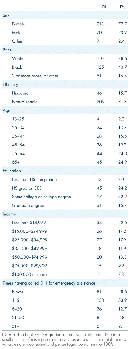 Table I provides data about the demographic characteristics and the 911 experiences of respondents. Most respondents (72.7%) identified as female. Of the respondents surveyed, 43.7% identified as Black, 38.5% identified as White, and 16.4% identified as another race (including Asian, Native American, or Pacific Islander) or two or more races; most respondents (71.3%) were non-Hispanic. About half of the respondents were over the age of 55 years. A large percentage of respondents had completed high school (24.2%), or some college or an undergraduate degree (52.2%), and more than half (57.6%) reported an income of less than $35,000 annually. Most respondents had either never called 911 for emergency assistance (28.5%) or had called between 1 and 5 times (53.9%).