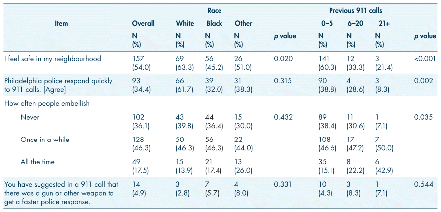 Table II presents participant experiences with and perceptions about 911 services and neighbourhood safety across subgroups defined by race and number of times summoning 911 assistance. Disagreement with the statement that Philadelphia Police respond quickly to 911 calls was high overall (65.6%) and was positively correlated with having called 911 previously (Chi-square p=.002; Cochrane Armitage Trend Test=0.027). Table II also presents respondents’ perspectives on and experiences of call embellishment. There was a positive and graded relationship between the perception that embellishment occurs and previous times calling 911 (Cochrane Armitage Trend Test=0.005), with agreement ranging from 62% among respondents with five or fewer lifetime calls to 93% among respondents with more than 20 previous 911 calls. In contrast, the 5% of respondents who reported suggesting themselves that there was a gun or other weapon present to get a faster response were not disproportionately distributed across the three groups (Chi-square p=.544). No statistically significant differences were observed on these items between different racial subgroups. Just over half (54.0%) of respondents reported feeling safe in their neighbourhood.