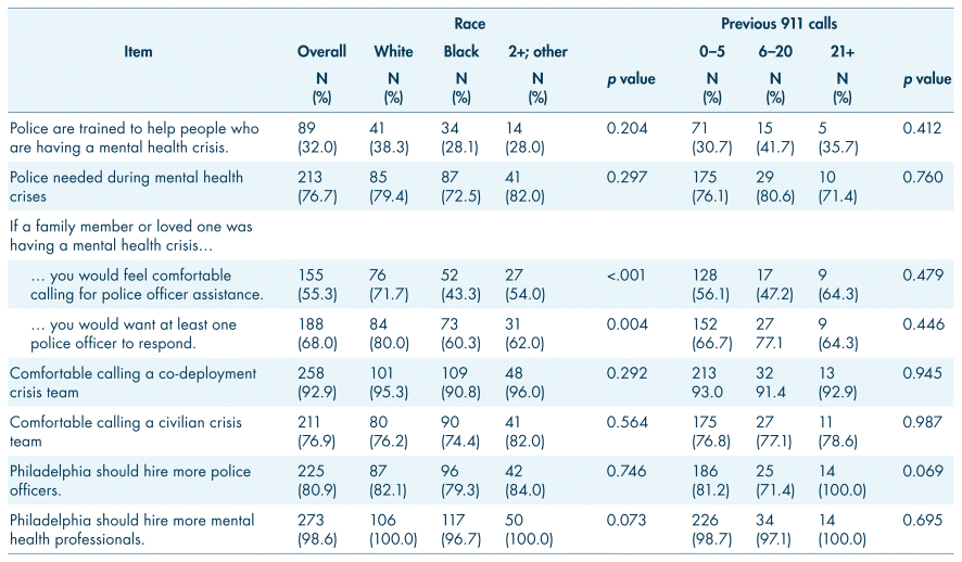TABLE III Perspectives on police and alternative responses to mental health crises, by race and previous 911 calls