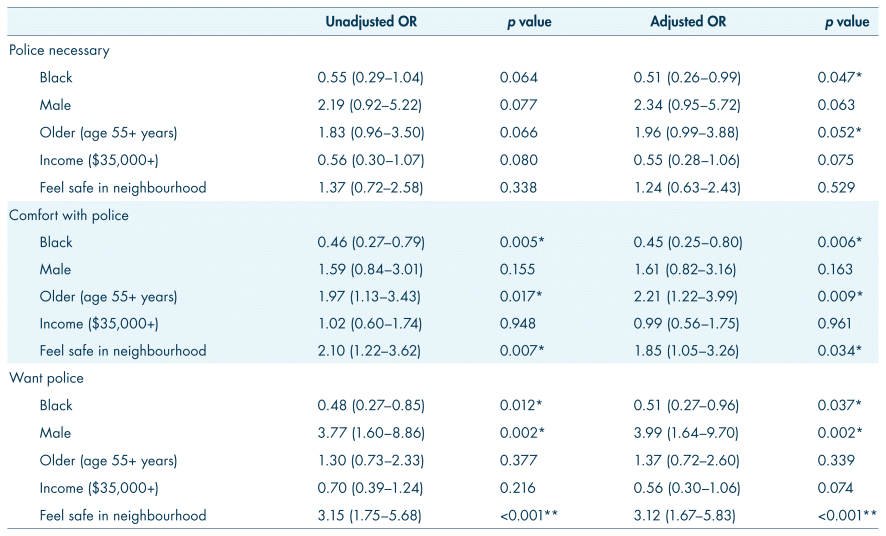 Table IV presents the findings of logistic regression models exploring the relationship between sociodemographic predictors (race, gender, age, income, and feeling safe in their community) and the perspectives of respondents on the three preference dimensions for police involvement in mental health responses. Black respondents were 50% less likely to believe police were necessary (adjusted OR 0.51, p=.047) and older respondents were 96% more likely to believe police were necessary (adjusted OR 1.96, p=.052). Black respondents were similarly less comfortable (adjusted OR 0.45, p=0.006) and older residents were similarly more comfortable with police involvement (adjusted OR 2.21, p=.009). Respondents who reported feeling safe in their community were also more likely to report being comfortable calling the police (adjusted OR 1.85, p=.034). Finally, Black respondents were less likely to want a police officer involved (adjusted OR 0.51, p=.037), while feeling safe in the community (adjusted OR 3.12, p<.001) and being male were associated with higher odds of wanting a police officer present (adjusted OR 3.99, p=.002).